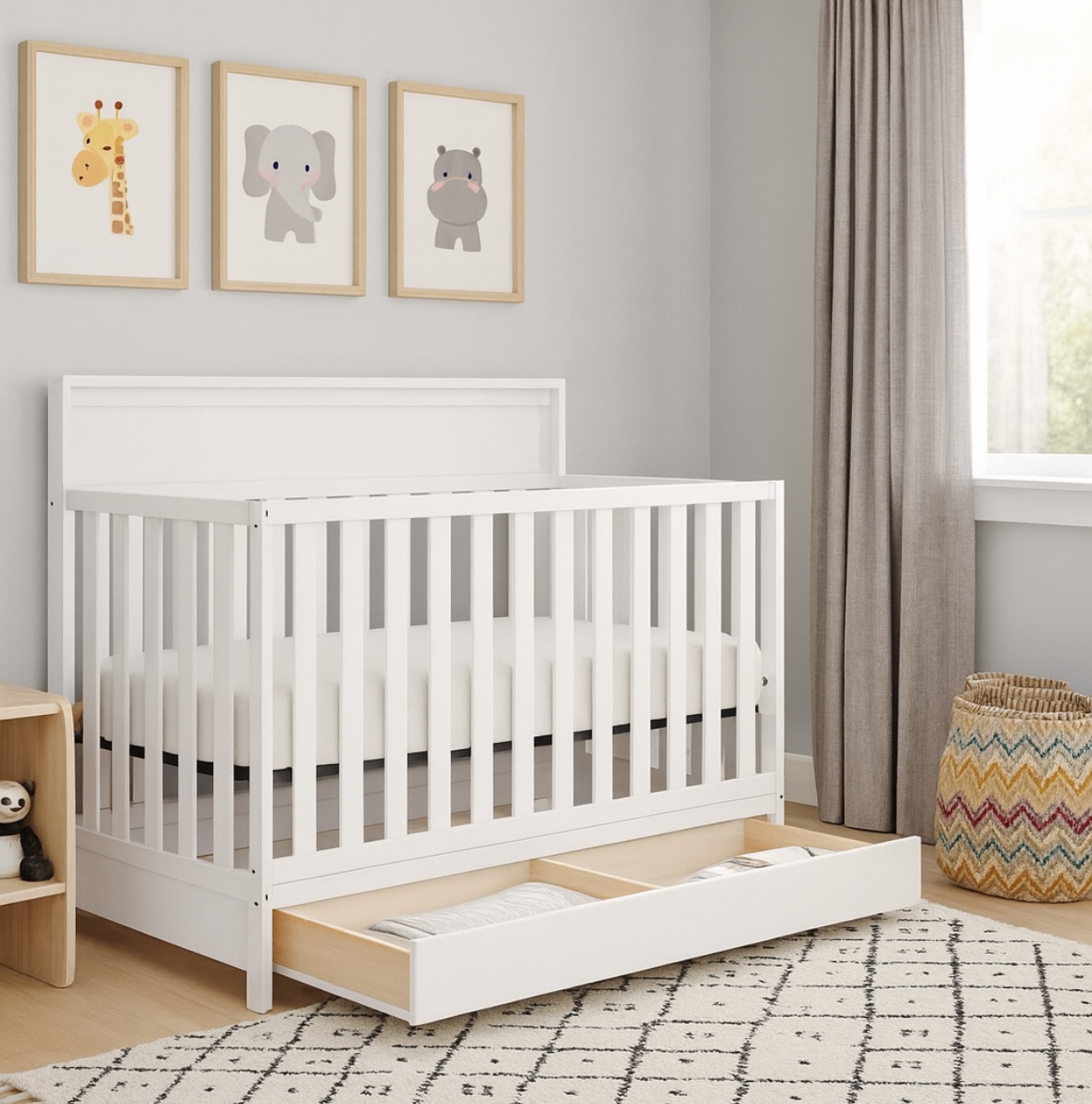 SALE!IN STOCK! A modern, solid pine 4 in 1 convertible crib with understorage drawer that converts to toddler bed and double bed with conversion kits (sold separately). Toddler rail is $129. Double bed kit is $199