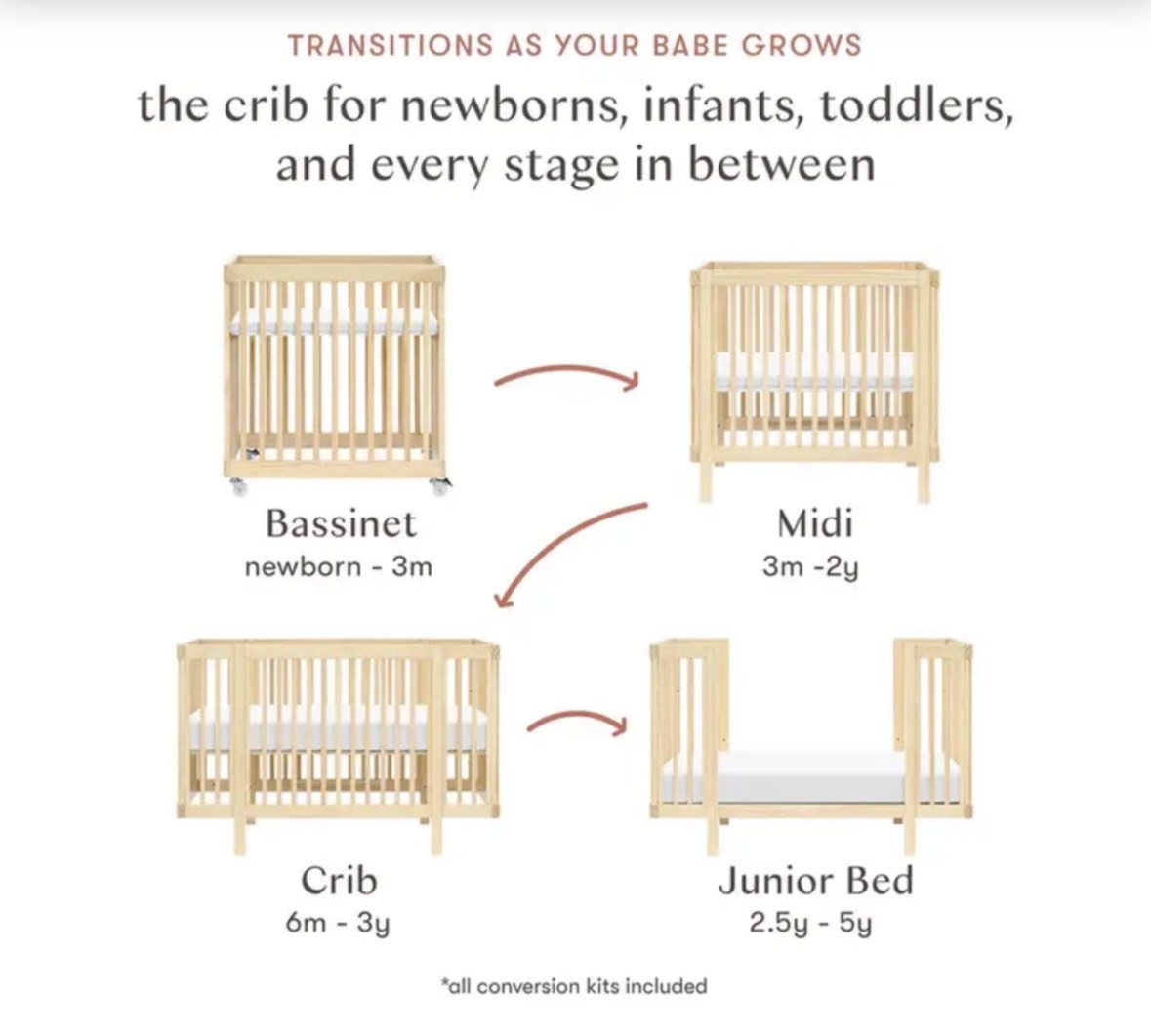 GROWS AT THEIR PACE & ADAPTS TO YOUR SPACE: Transitions from bassinet (30â€x19.5â€x34.75â€) to our transitional midi size (37.75â€x31â€x35.25â€) and to standard crib & junior bed. Suitable from newborn to 5 y/o.