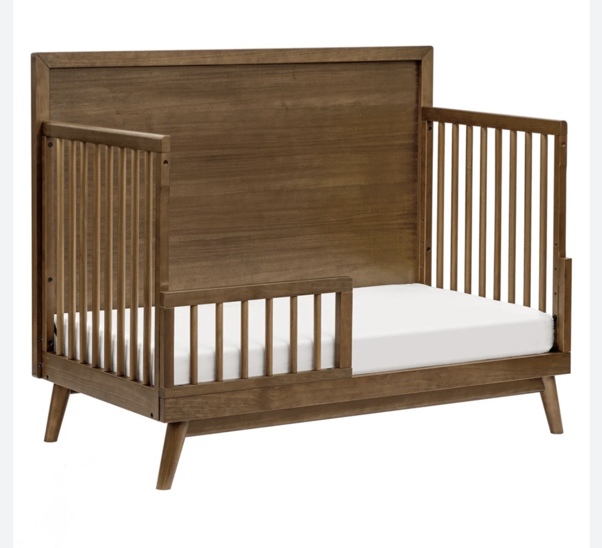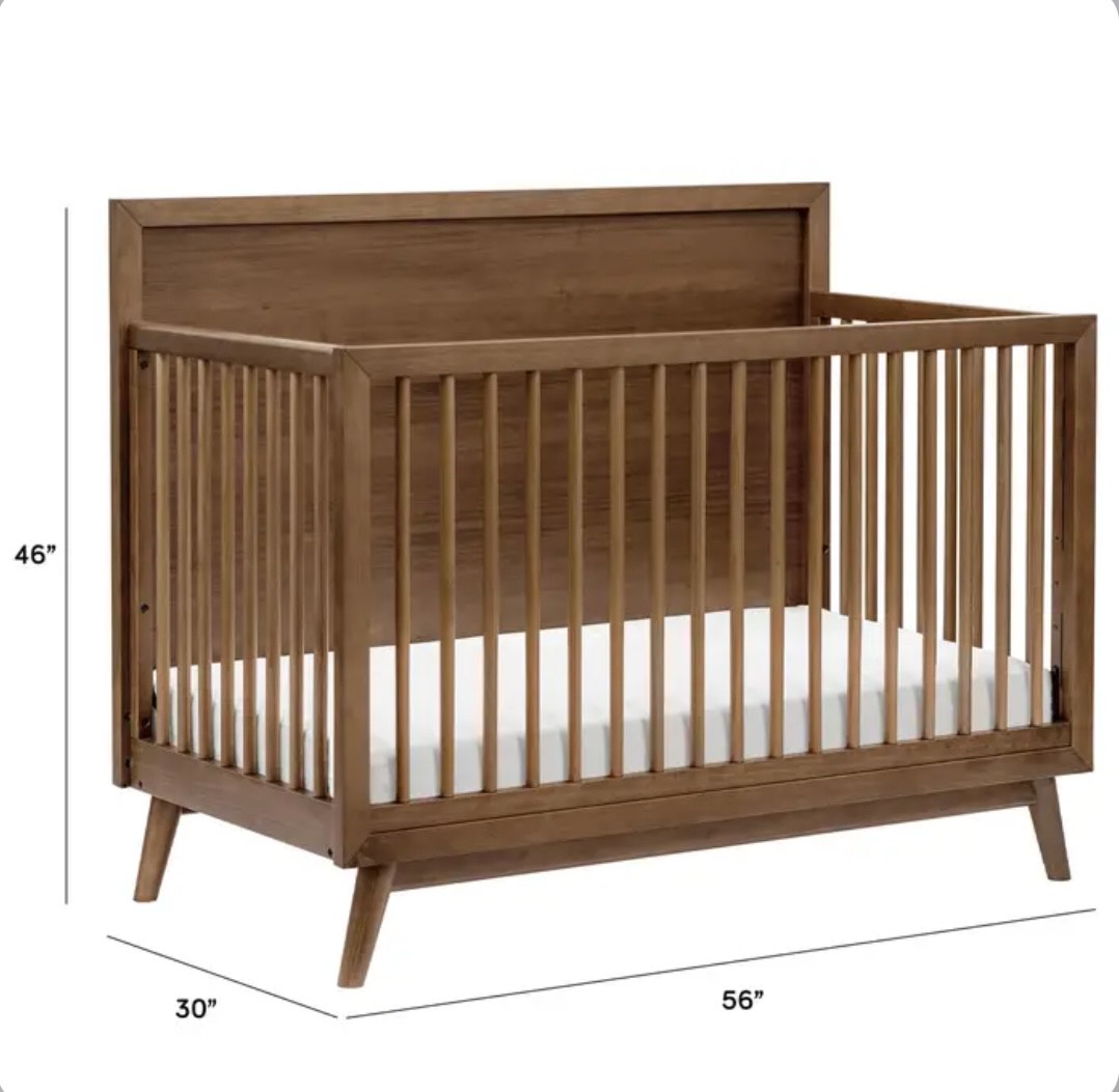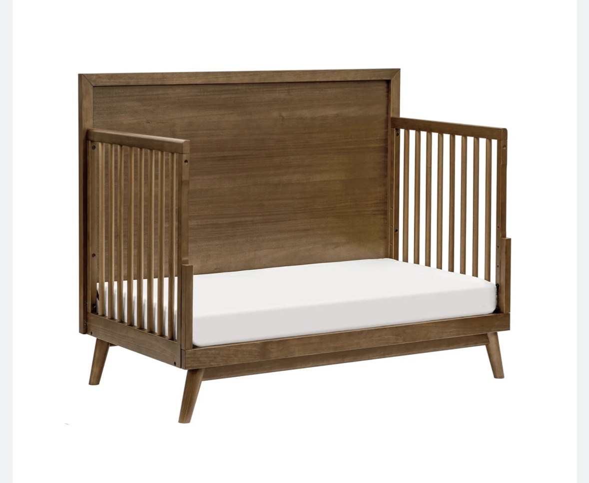 The Palma 4-in-1 Convertible Crib and dresser set is the ultimate centerpiece to a stylish mid-century modern nursery. The Palma crib grows with your babe with an included toddler bed conversion kit allowing you to seamlessly convert from crib to toddler bed to daybed. And with a high headboard, it can transition into a timeless piece with an additional full-size bed conversion. Made with sustainable materials and GREENGUARD Gold certified for indoor air quality.